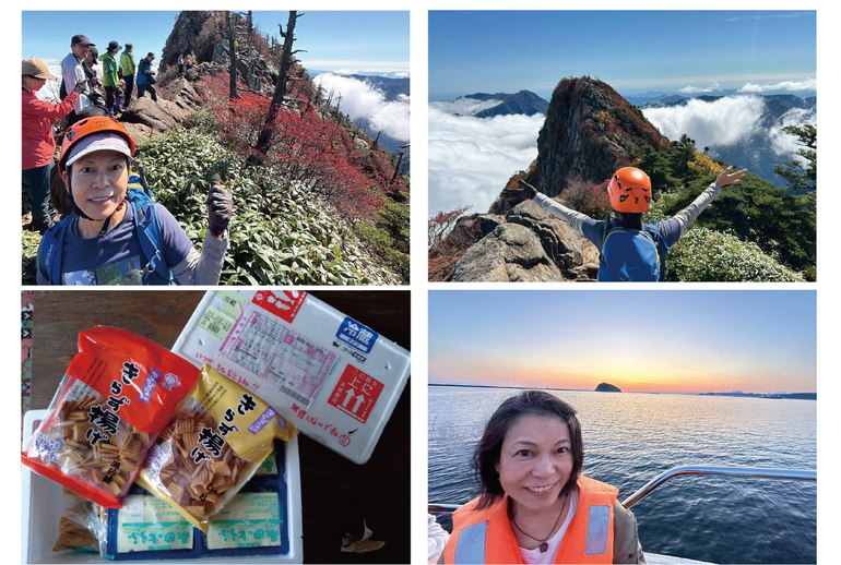 右上、左上)年々登山の魅力にはまり、今では年間20座を目標に登っています。石鎚山(西日本最高峰の百名山)は高所恐怖症の私が細尾根を歩いてなんとか山頂にたどり着いた思い出深い山。左下)屋久島で出会たお豆腐屋のご夫妻。折々、熱いメッセージの詰合せを送ってくれます。右下)印象に残っている風景の一つ。室蘭ナイトクルーズ、「日本有数の工場夜景」視点を変えた海からの景色。