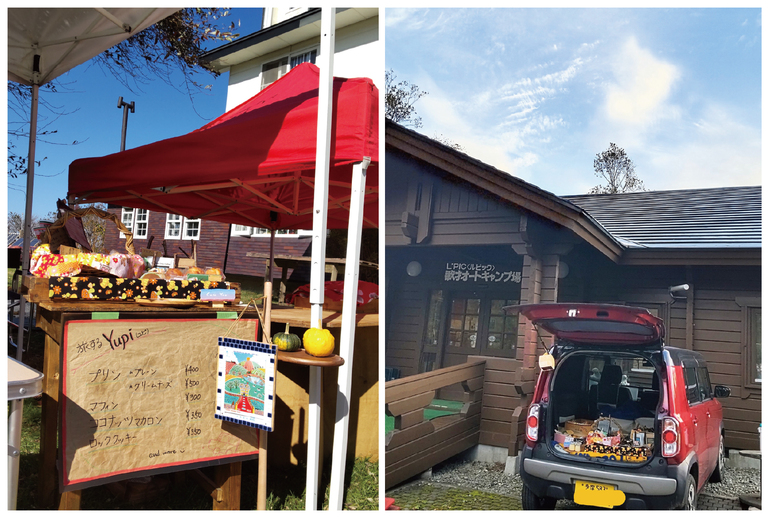 左)CAFE YUPI 小さな町の小さなマルシェ出店、興味があればどこでもどんなスペースでも参加します!(2023/10) 右)黒松内町キャンプ場での行商。愛車のトランクを開けるとお店に早変わり!
