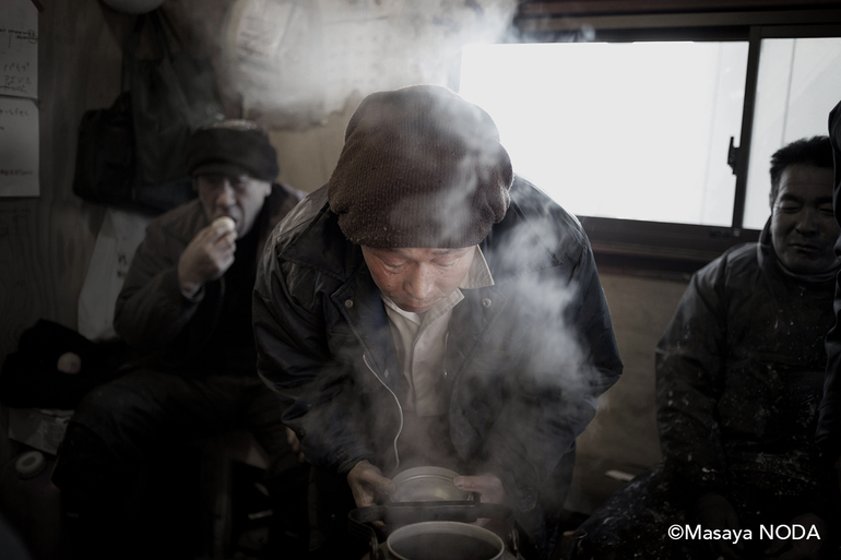 年が明けた1月5日、大槌町では震災後に初めてとなるサケの定置網漁が再開された。港を出航した2隻の久美愛丸は、岩手造船所で修理されたもの。サケを甲板に引き揚げるタモ網は、東さんが作り上げたものだ。初漁の翌日、男たちの弁当には焼き鮭が添えられ、白米には新鮮なイクラがたっぷりとのっていた。海の幸の輝きに、私は営みのつながりを感じた。