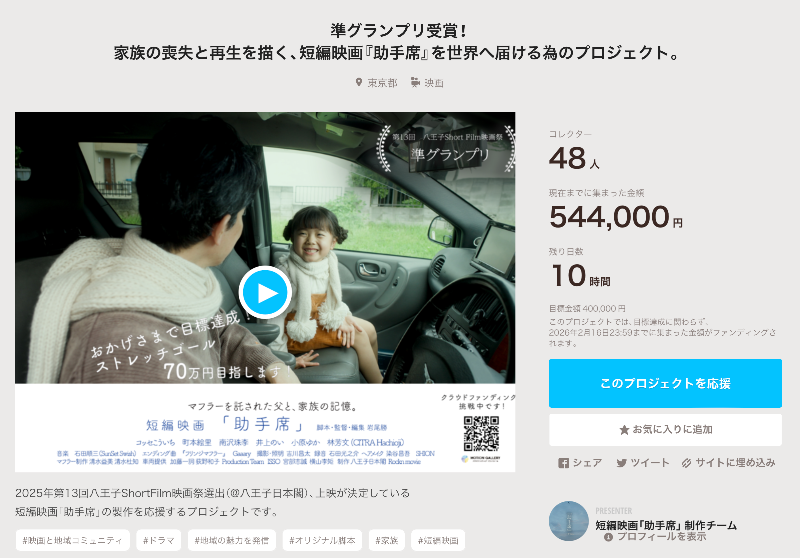 短編映画「助手席」の製作を応援するプロジェクトです。